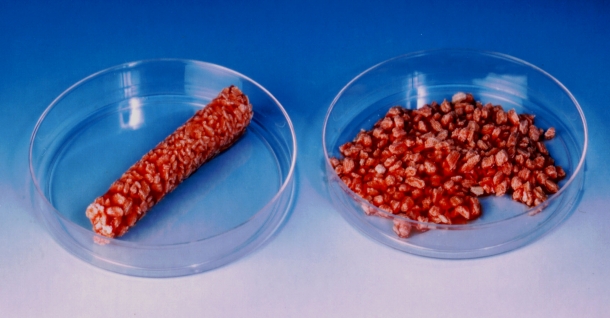 Imagen 2. Aspecto de los cilindros de AGF. Se obtienen factores a partir de la sangre del propio paciente que, una vez procesados, se mezclan con proosteon. La mezcla tiene una consistencia elastica y una morfologia cilindrica ideal para su empleo como material de injerto intertransverso.