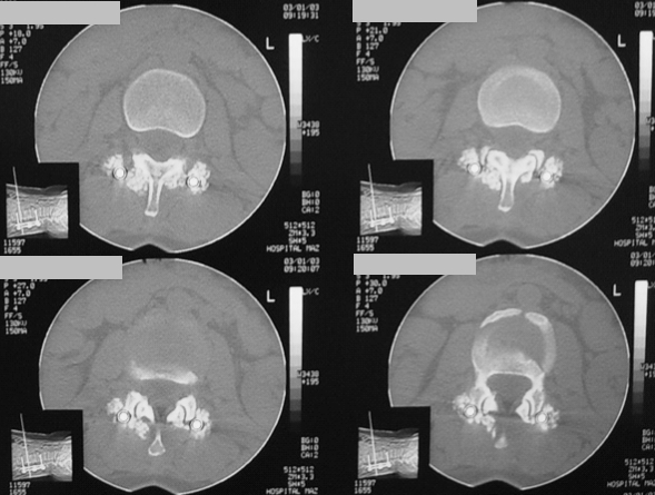 Imagen 4. TC de una artrodesis transpedicular con injerto de AGF obtenido a los 11 meses de la intervencion. Puede verse como la formacion de hueso envuelve literalmente las barras de la artrodesis, solidarizandose con el hueso vertebral.