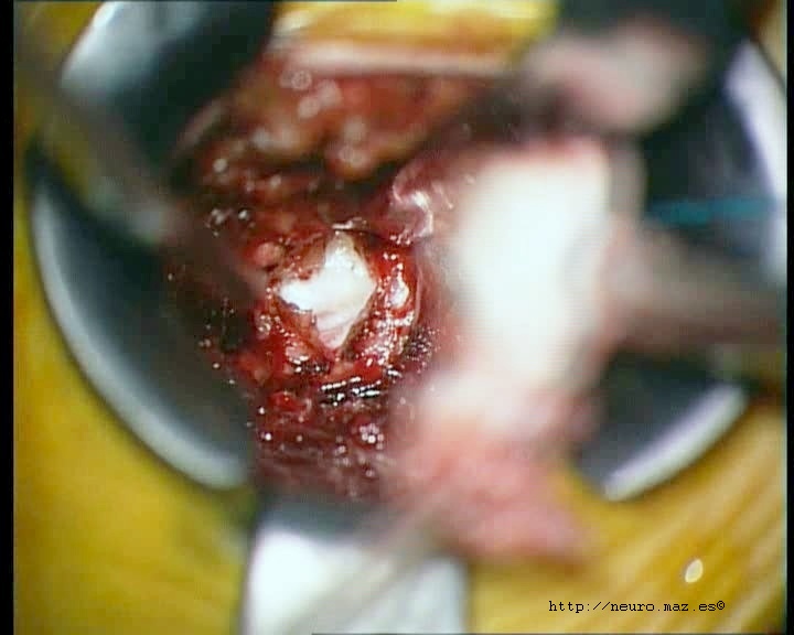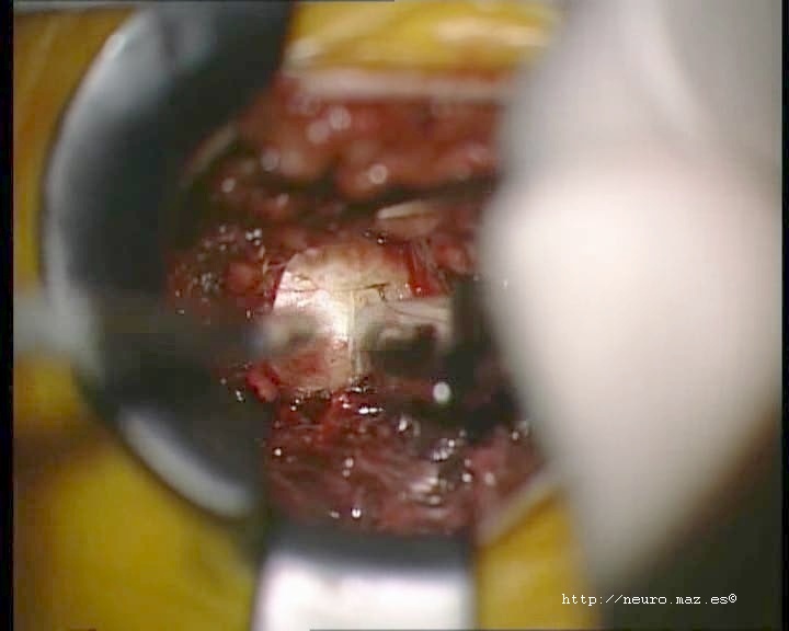 Otras veces, tanto el ligamento amarillo como la lámina son robustos y verticales dificultando una flavectomía (apertura con bisturí del ligamento amarillo) directa de entrada.