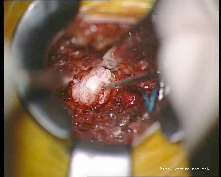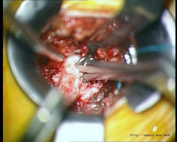 Una vez liberado el receso, puede procederse a explorar la raíz mediante disectores de microcirugía. Estos permiten un manejo de la raíz muy efectivo. Ya que en esta fase una raíz comprimida tiene numerosos vasos ingurgitados (plexos epidurales) bajo microscopio (e, insistimos, difícilmente sin el) puede procederse a la identificación de estos y, en su caso, a su coagulación, lo que garantiza una perfecta hemostasia. Para esta tarea es insustituible la pinza bipolar para microcirugía, ayudándonos de la aspiración y de la colocación de lentinas de algodón.