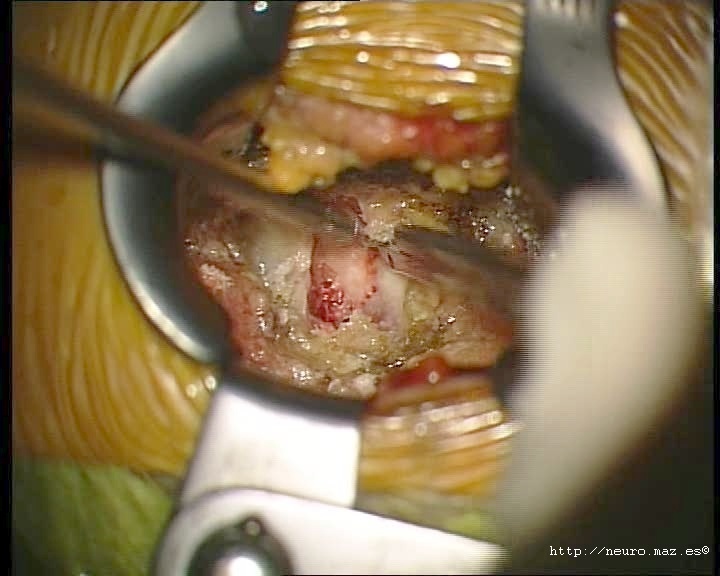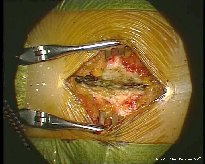 Posteriormente, se realiza la flavectomía (apertura del ligamento amarillo) y se progresa intracanalarmente mediante la pinza de Kerrison.