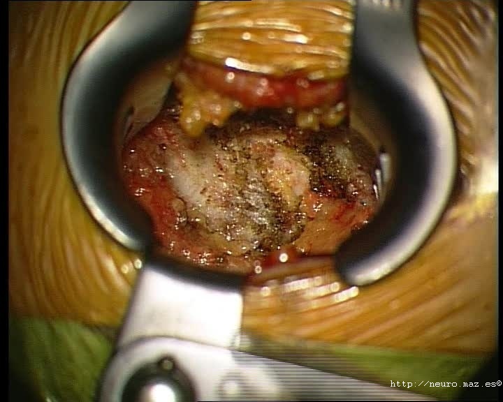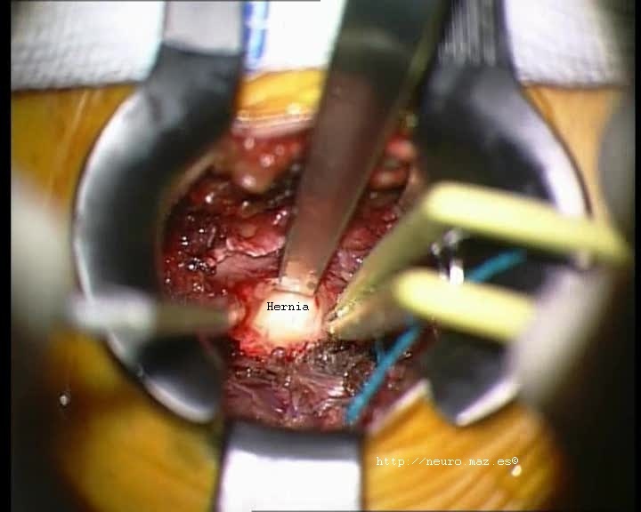 Nos parece importante exponer la hernia en su totalidad, como si se tratara de un tumor intracanalar, ya que sólo así nos haremos idea de su situación de su emplazamiento, de sus limites, de sus relaciones y, sobre todo, evitaremos dejar secuestros que hubieran migrado subligamentariamente. Para ello se emplean lentinas de algodón, micro-disectores, micro-ganchos y la coagulación bipolar. En este momento es cuando podemos ver si hay una buena correlación con la neuroimagen, y si hemos expuesto la totalidad del disco herniado.