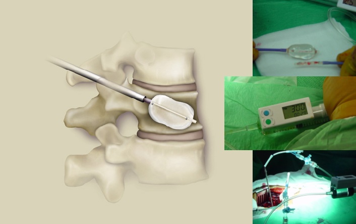 CifoplastiaSe trata aquí de restaurar la anatomía de la vértebra aplastada introduciendo en su interior un globo o balón que se va hinchando paulatinamente hasta expandir el cuerpo vertebral si es posible a la forma que tenía antes de resultar deformado (de ahí el nombre de cifoplastia). Posteriormente, se deshincha el balón y en el hueco así formado se introduce una sustancia (Calcibón) que solidifica aportando rigidez al cuerpo vertebral lesionado.
