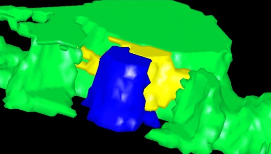 Hernia de disco simpleLa primera imagen corresponde a una reconstrucción tridimensional efectuada a partir de la RNM de uno de nuestros pacientes representa la apariencia de una extrusion discal L//L5 derecha y su relacion con la raiz espinal. El disco se ha caracterizado en amarillo, el hueso vertebral en verde y el saco dural y raiz en azul.