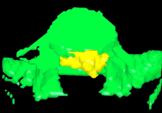 Al ser posible extirpar virtualmente el hueso, en la imagen superior se muestra la apariencia del interior del canal sin lamina. Ello permite al cirujano conocer exactamente la topografia, emplazamiento y relaciones del abombamiento o secuestro discal, lo que garantiza una actuacion quirurgica muy precisa sobre todo cuando se complementa con microcirugia. Tambien se reduce al minimo la posibilidad de dejar restos discales emigrados pues son perfectamente representados e identificados preoperatoriamente, y su emplazamiento y relaciones son conocidos por el cirujano y visualizados en un espacio tridimiensional. A continuacion presentamos la apariencia real de la hernia discal, una vez retirados virtualmente saco y raices: